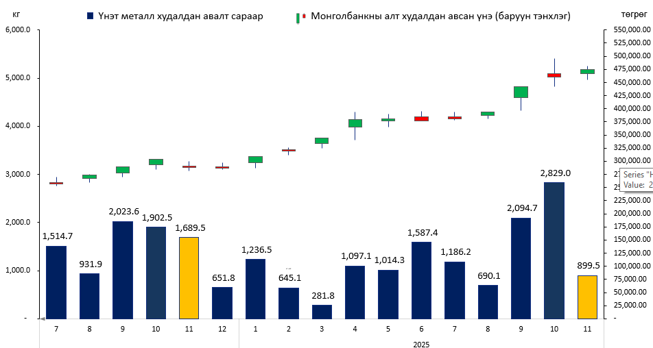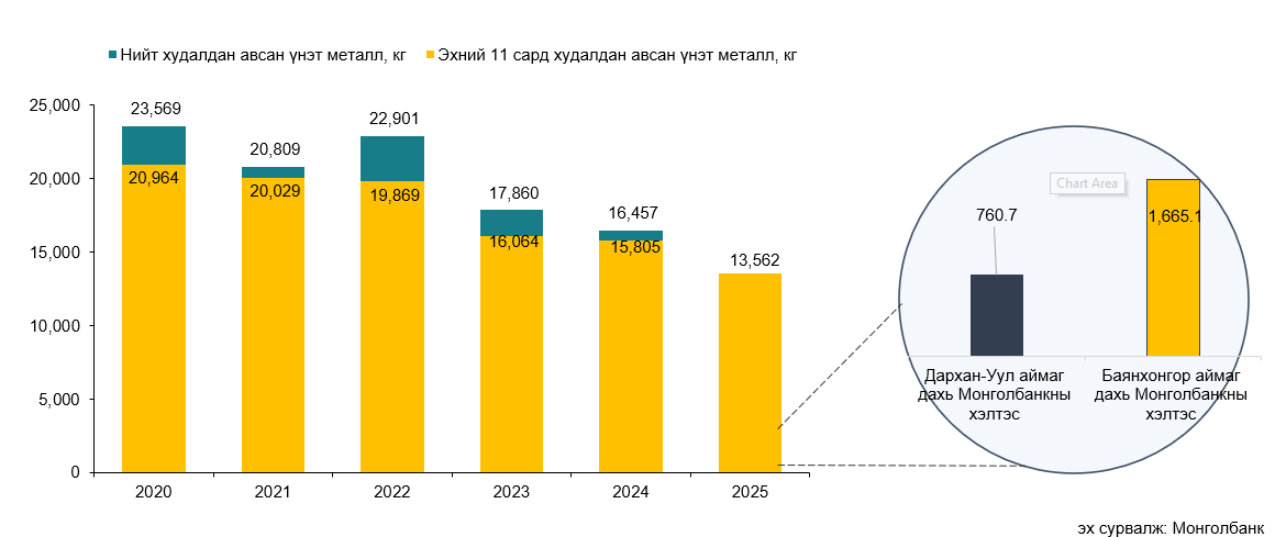 Монголбанк 2025 оны 11 дүгээр сард 899.5 кг, оны эхнээс өссөн дүнгээр нийт 13.6 тонн үнэт металл, үүнээс Дархан-Уул аймаг дахь Монголбанкны хэлтэс 760.7 кг, Баянхонгор аймаг дахь Монголбанкны хэлтэс 1,665.1 кг үнэт металл худалдан авсан байна. Энэ нь өмнөх оны мөн үетэй харьцуулбал  14.2 хувиар буурсан үзүүлэлттэй байна. Монголбанкны үнэт металл худалдан авах үнийг дэлхийн зах зээл дээрх үнээр тогтоодог. 2025 оны   11 дүгээр сард алт худалдаж авах дундаж үнэ 467,367.93 төгрөг байв.