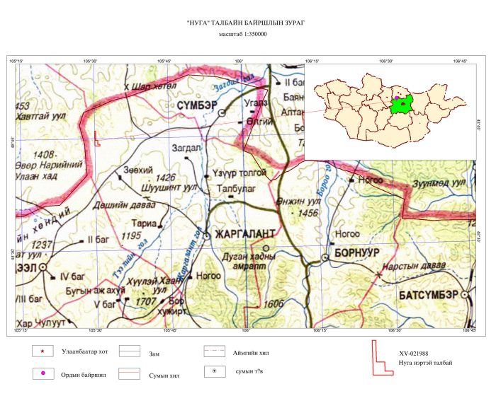 Төв аймгийн Жаргалант сумын нутагт байрлах “Нуга” “XV-021988 173.53 га“ хайгуулын талбай нь Улаанбаатар хотоос баруун хойшоо 124 км Төв аймгаас баруун хойшоо 158 км, Жаргалант сумын төвөөс баруун хойшоо 38 км орчим зайд оршдог. Баруун аймгуудыг холбосон төв засмалаас хойд зүгт 110 км-т оршино.