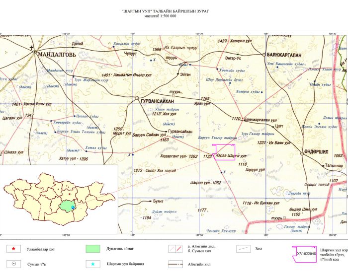Дорноговь аймгийн Өндөршил Гурвансайхан сумдын нутагт байрлах “Шаргын уул” XV-022048 10778.7 га хайгуулын талбай нь Улаанбаатар хотоос зүүн урд зүгт 410 км, Дундговь аймгаас зүүн урд зүгт 127 км, Гурвансайхан сумаас зүүн урд зүгт 37 км, Өндөршил сумаас баруун зүгт 46 км орчим зайд оршдог. Урд аймгуудыг холбосон төв засмалаас 128 км-т оршино.
